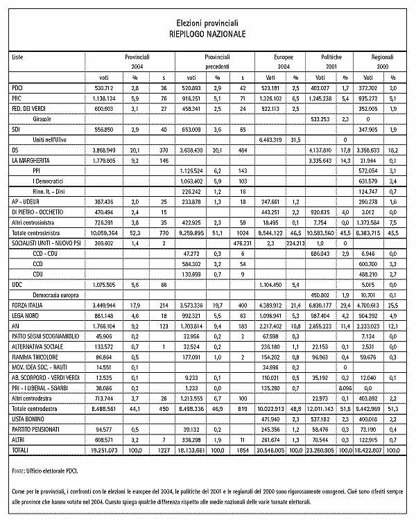 Va altresì notato che nelle amministrative, presentandosi separatamente, i Ds registrano un discreto risultato, superando nelle provinciali il 20 per cento dei voti, contro il 17,8 delle ultime politiche (con riferimento alle Province in cui ora si è votato): mentre la Margherita scende dal 14,3 delle politiche al 9,2 per cento. Ciò sembra confermare la valutazione che la decisione di optare per una lista unificata (la cosiddetta Lista Prodi) ha frenato una tendenza in atto - che andava nella direzione di una ripresa elettorale dei Democratici di sinistra -, che è almeno in parte confermata dal buon risultato di questo partito nelle vecchie `Regioni rosse' e soprattutto in tradizionali roccaforti come Bologna, Modena, Reggio Emilia, Siena, dove ha superato o si è riavvicinato al 40 per cento dei consensi.